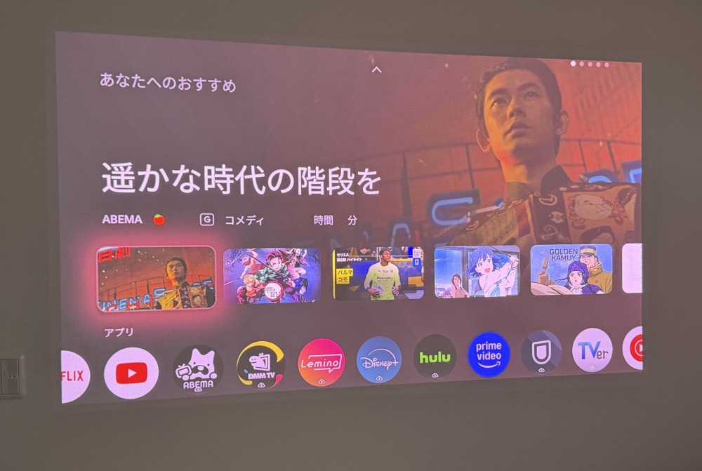 「利用可能なストレージ容量」についてですが、初期設定時におすすめされる主要アプリを全てダウンロードした状態でも、50GBの空き容量がありました。Amazonプライムビデオやディズニープラスなどの主要な動画配信アプリもインストール済みです。基本的にWi-Fi環境で使用するホームプロジェクターなので、スマホやポータブルプロジェクターのようにコンテンツをダウンロードする必要もないので、ストレージ周りは問題ないかなといった感じ。