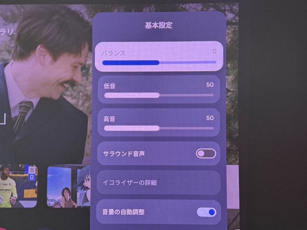 音質のカスタマイズ性も充実しており、「標準」「映画」「スポーツ」「ゲーム」と既存プリセットから視聴するコンテンツに合わせて音響を最適化することもできます。この中では「映画」がもっとも広がり感が豊かで、低温の安定感があると感じました。帯域別のイコライザー設定で自分好みの音に調整することもできます。